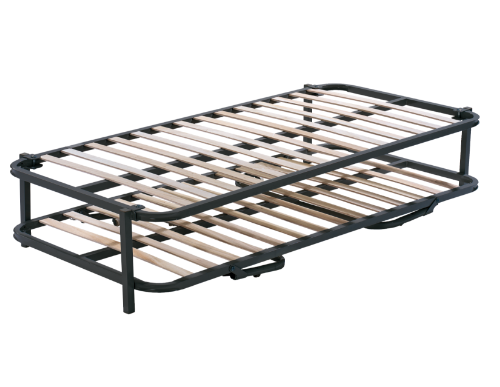 Estrado elevatório, com pés de abertura automática e rodas deslizantes. Transforma uma cama simples em cama dupla num abrir e fechar de olhos, sendo a solução perfeita quando o problema é economizar espaço útil.