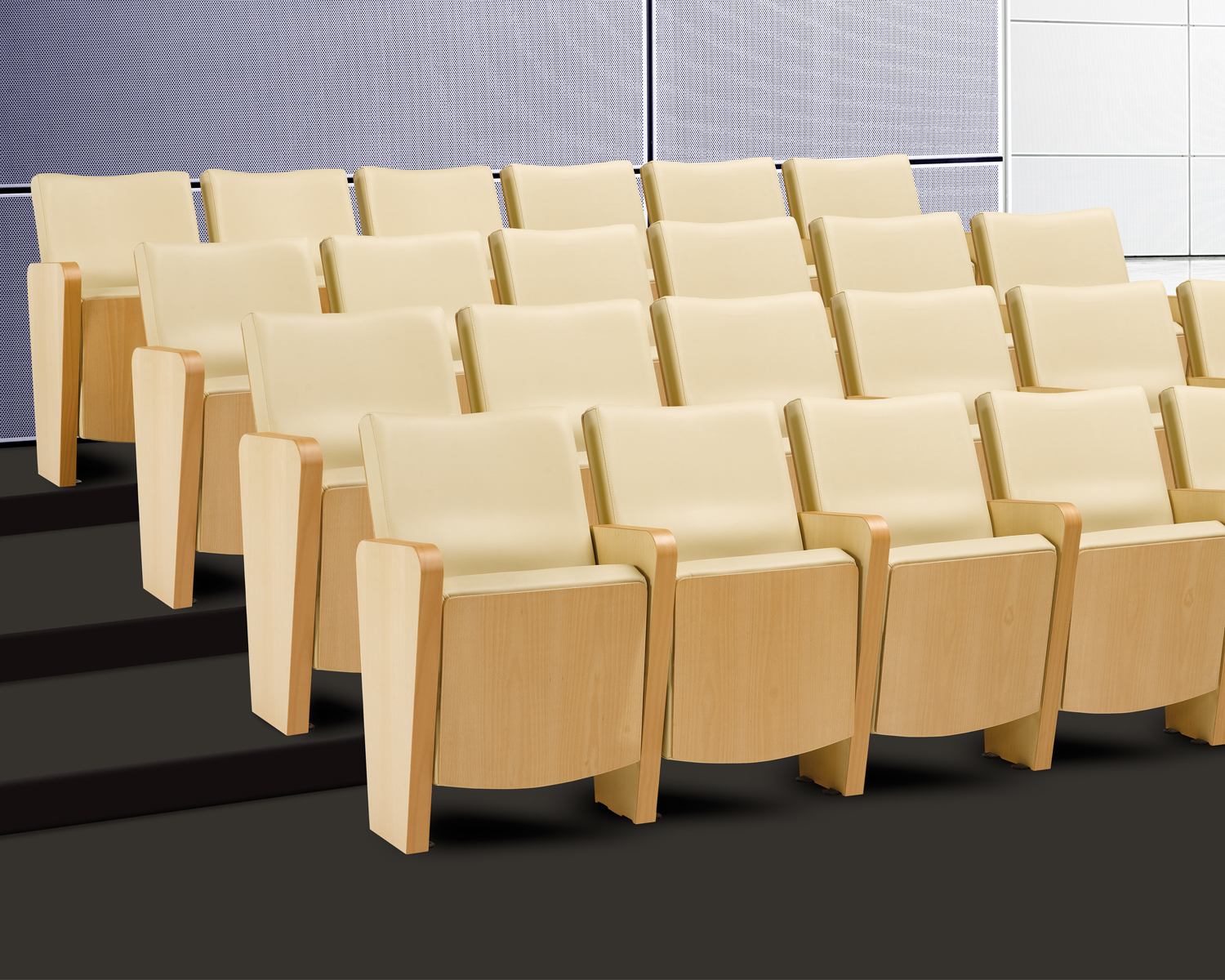 Elegante e funcional, a poltrona Bless possui assento rebatível e ergonómico. Quando usada em bateria, os lugares são divididos por braço de madeira que também serve de apoio.