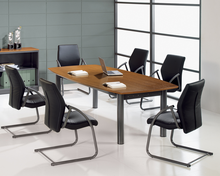 Com um original formato oval, é constituída por uma base de dois ou quatro pés metálicos cilíndricos que servem de apoio às superfícies em diversas madeiras, selecionadas, que lhe conferem elegância e um estilo muito próprio. Uma aposta certeira quando o objetivo é marcar a diferença em qualquer sala de reunião.